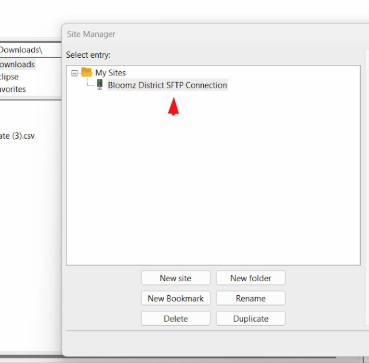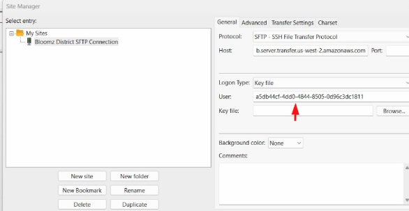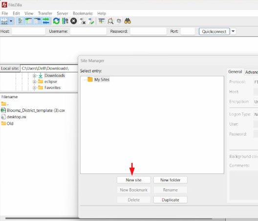 - Choose File, and then choose Site Manager and In the Site Manager dialog box, choose New site.