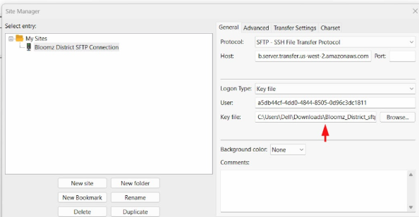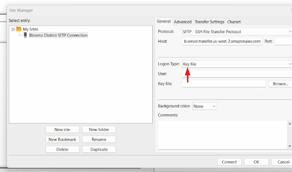 - Logon Type, choose Key file. For Key file, choose or enter the SFTP Private Key.